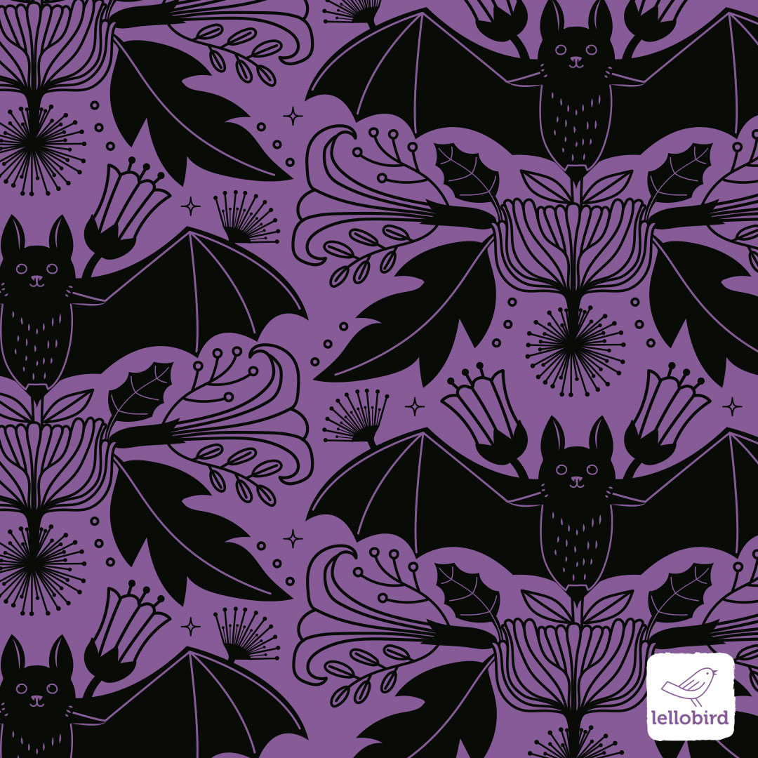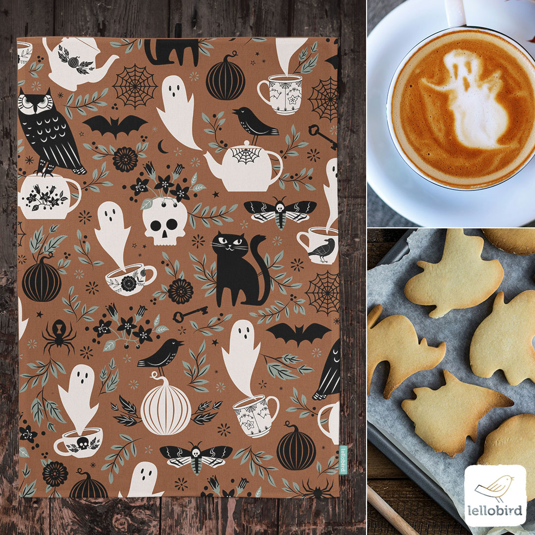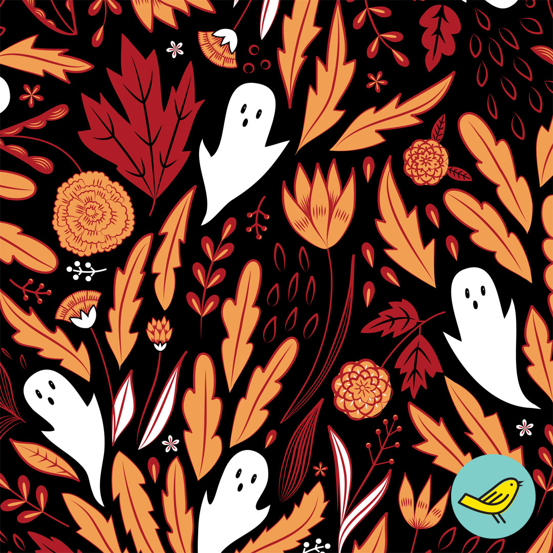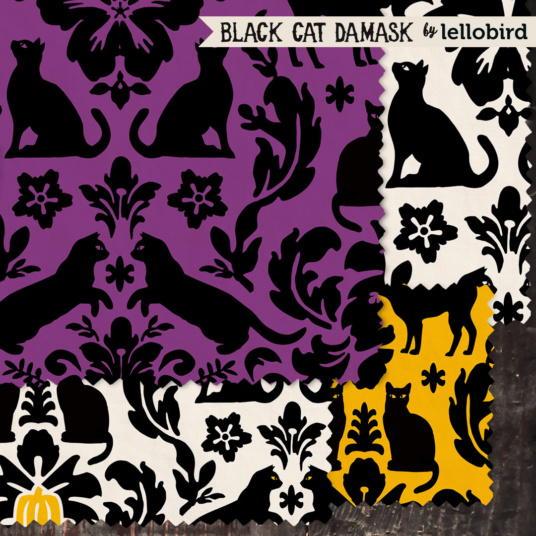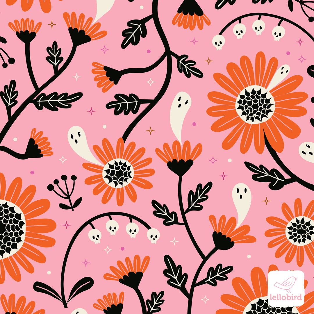 Blending spooky and cute, my Halloween designs usually feature bright colors and whimsical illustrations of pumpkins, ghosts, black cats and other spooky-season staples. I especially enjoy working in a playful, retro mid-century-inspired style, like in my Spooktacular Barkcloth design.
