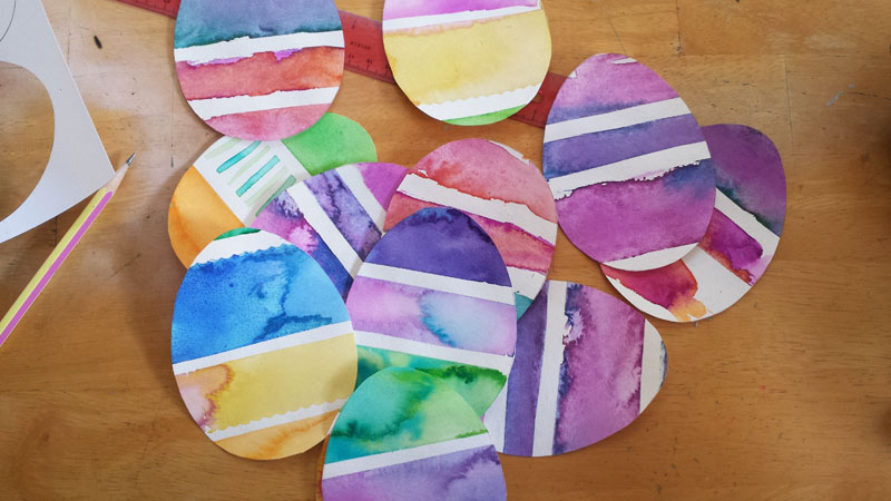 Once the paint dried (that step took almost 24 hours, so plan ahead), we peeled off the tape to reveal the white stripes on our eggs-to-be. The paper on the left is mine; the right is kid-made. Our tape took off a tiny bit of the top layer of the paper, but not enough to bother me.